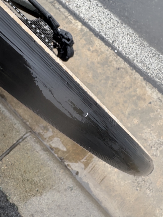 シーラントが効いているので、ある程度の空気圧は保ってくれているのですが、雨のせいか固まり具合が今一つ。3気圧上いれるとまた空気が漏れてしまいます。それでも、この雨のコンディションで走れるくらいの気圧を保ってくれるのだから助かりました。