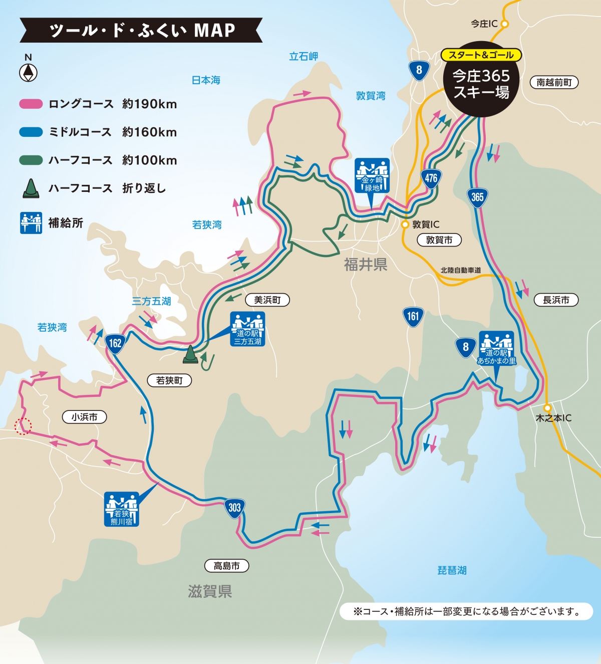 私が参加したのはミドルコース160km。スタート位置の今庄スキー場駐車場から南下。滋賀県に入り琵琶湖一周のコースを一部通っています。そこから少し西に行ってから北上し、日本海若狭湾沿いを通るコースです。