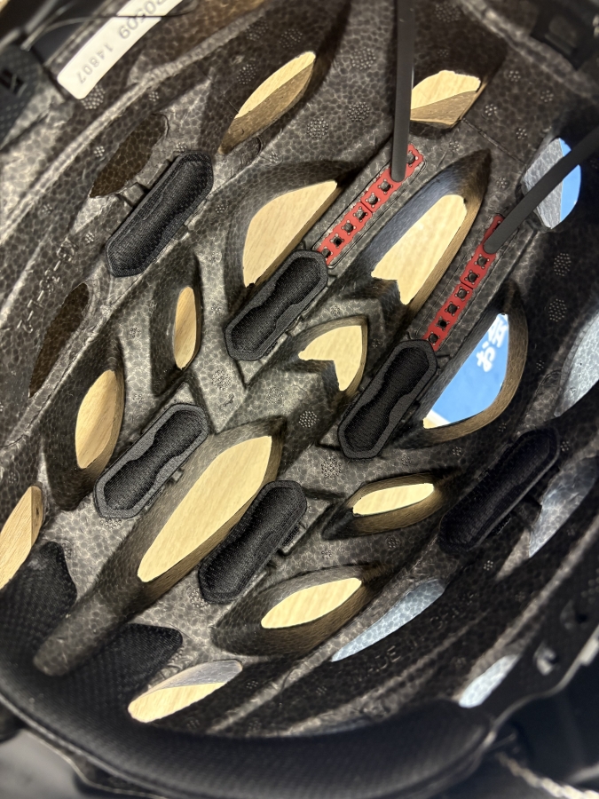 その秘密はセミフローティング構造。小さなパッドを複数個所配置し、ヘルメット本体と頭の接触箇所を可能な限り減らしてあります。必要な個所に必要な分だけパッドが配置されているので、被った時にしっかりかぶれた安定感と、無駄なパッドがないことによる通気性で快適性が向上しています。
