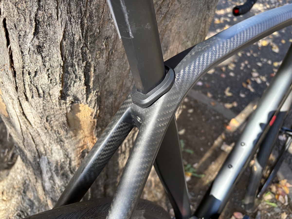 それもそのはず、タイヤクリアランスは34Cまで拡張されて、エアボリュームの大き目のタイヤも装備可能になっています。もともとロングライド、グランフォンドを意識して作られたモデルだけに、タイヤの選択肢の幅が広がることでより様々なフィールドに対応できそうですね。