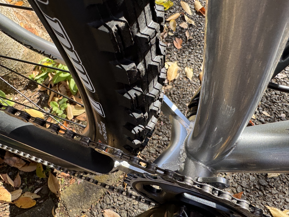 リアエンドから伸びたチェーンステーの丸パイプを、
