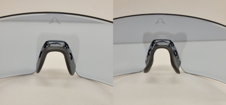 上の画像の様にノーズパッドが可動式なので「滑って落ちてきてしまう」、「頬骨にレンズが触れてしまう」等ライド中に落ち着かない・集中できないとならない様に自分の骨格に合わせて調整できる仕様となっています。