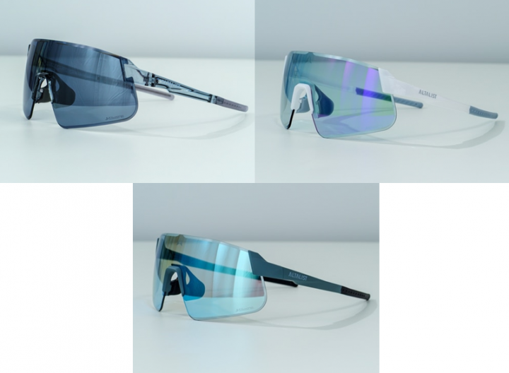 左上:クリスタルスモーク ( シルバーミラー/VIV20調光 )、右上:グロスホワイト ( パープルミラー/VIV20調光 )下:マットスモーキーブルー ( ブルーミラー/VIV20調光 )