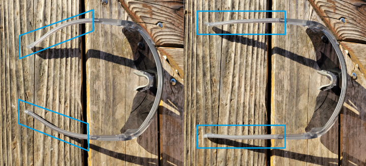 最近のスポーツアイウェアのトレンドでもある大型レンズを採用していますが、上の写真の通りR2よりも上下の高さがコンパクトになりスッキリした見た目ですね。それでも十分にレンズ面積が大きいことで上下左右の視界が広く確保され、ランニングはもちろんロードバイクやクロスバイクなど自転車競技でも大きなメリットとなります。