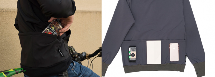 背中にはサイクルジャージのように三分割ポケットを装備していて、スマートフォンや補給食、グローブなどを収納できるのでポタリングや観光しながらのツーリングでもバッグを使わずに身軽に行動できます。普段着のように見えながら、しっかりサイクルウェアとしての機能を備えています。