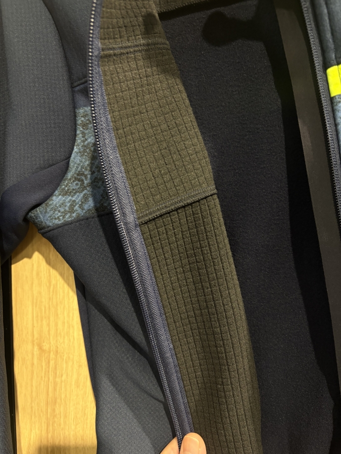 内側のフリースはブロック状になっており、汗を吸っても肌にべっとり張り付かないようになっています。