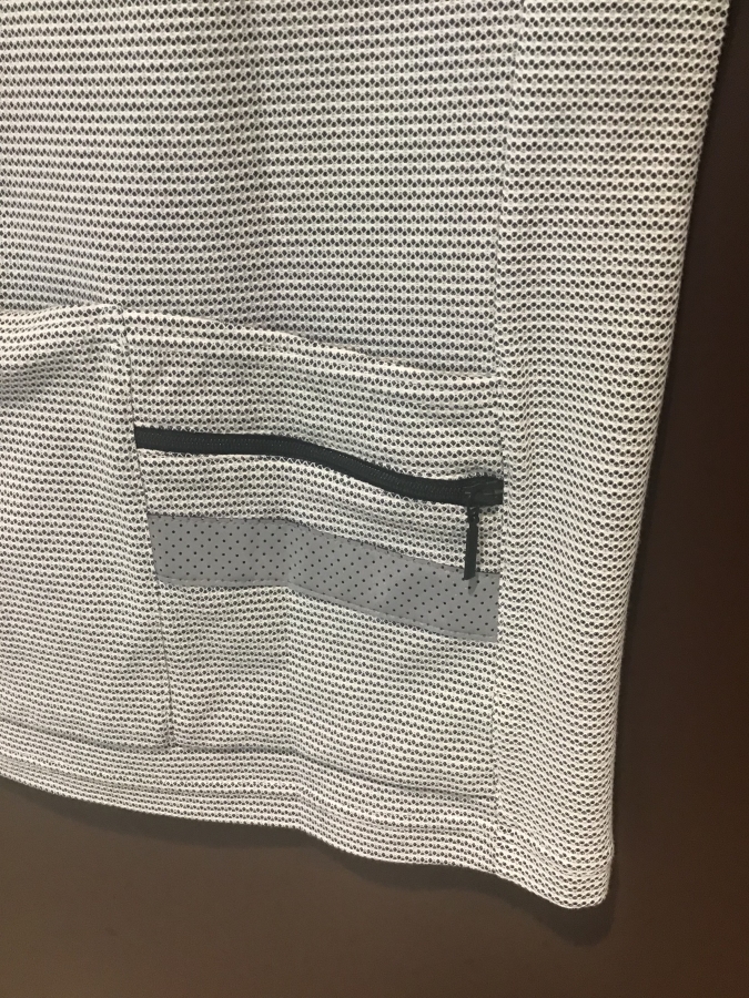 汗を吸ってすぐに発散する吸汗速乾性と紫外線カット機能を持つ素材でつくられ、背中には定番の3連バックポケット。