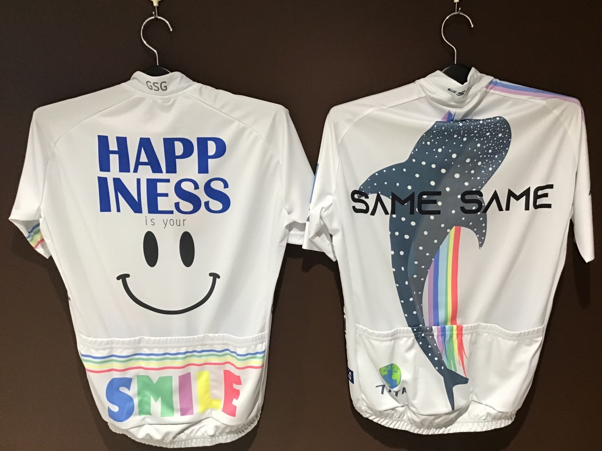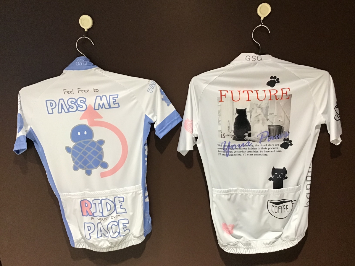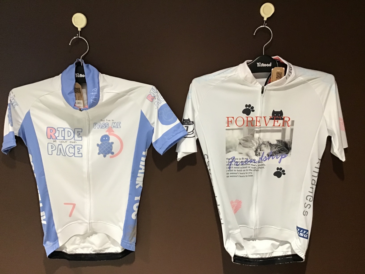 スマイルマーク、ネコ、イヌ、サメなど他にはないデザインのサイクルウェアが勢ぞろいです‼