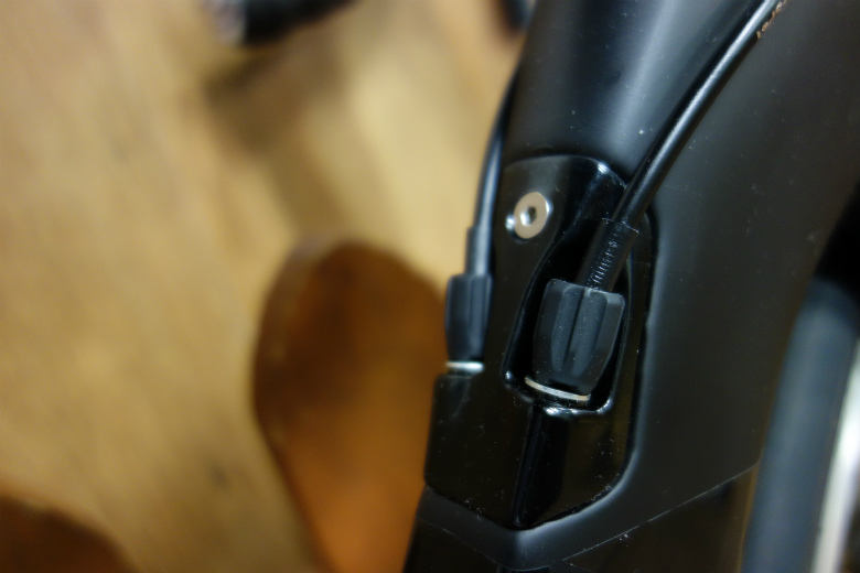 ワイヤーは内蔵式。シフトケーブルの侵入口は理想的な場所。ワイヤー調整用のアジャスターも兼ねてメンテナンス性も完璧。