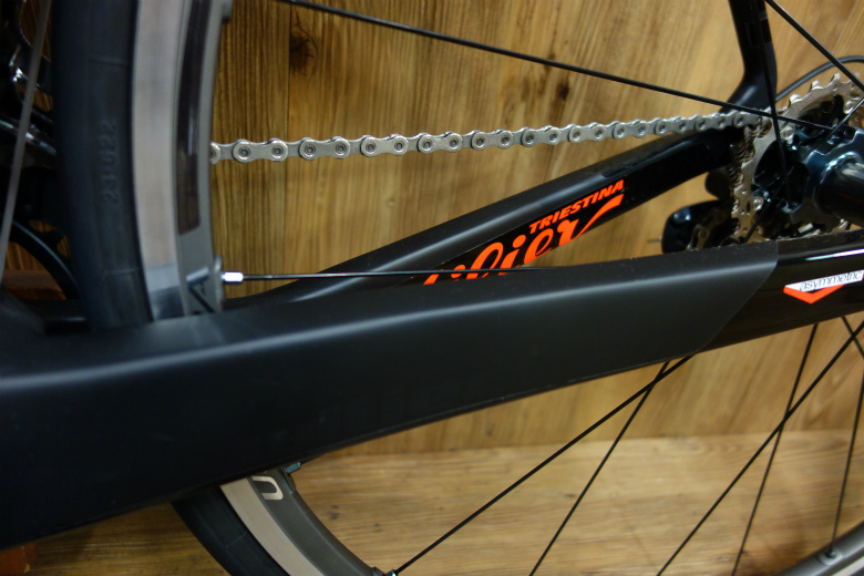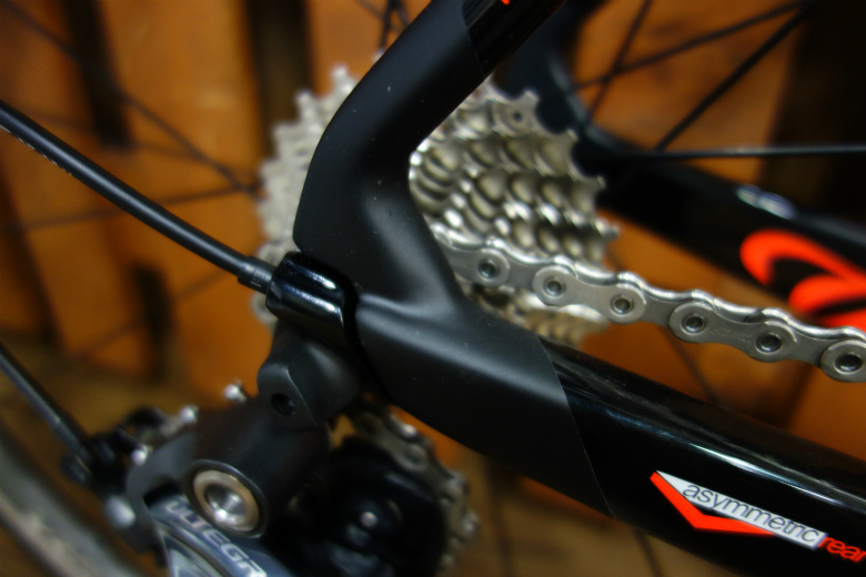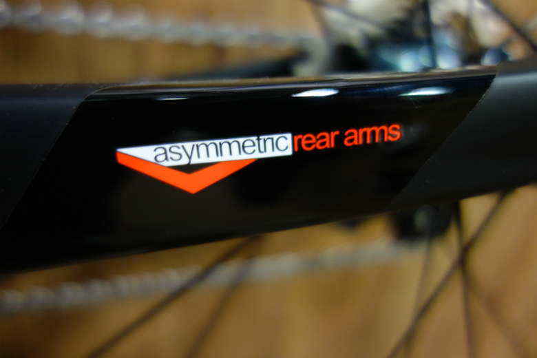 パワーを車輪に伝えるリアチェーンステーも左側はビックリするほどの太さ。左右非対称にすることでバランスの悪さを修正し安定感のあるライディングが可能です。