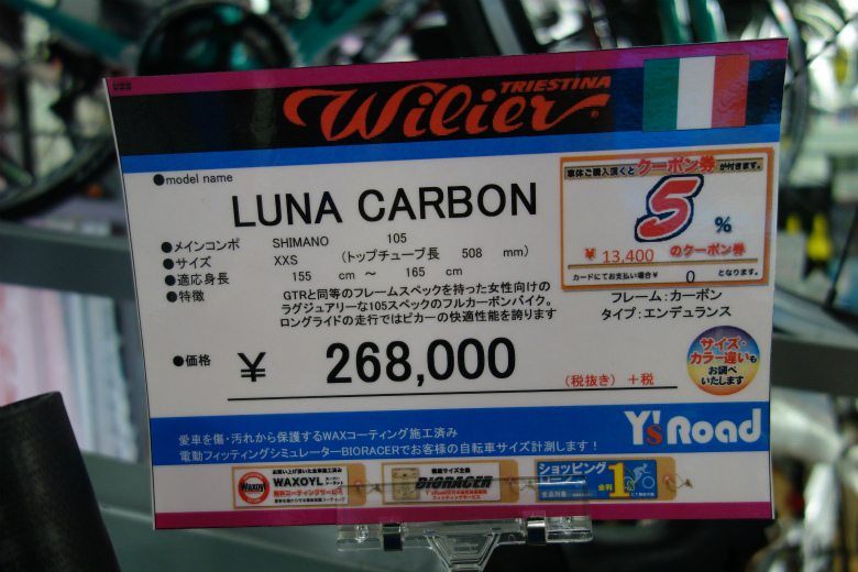 さらに貴重なレディースモデルLUNA CARBONも現品在庫でございます。XSとXXS両方揃っているのは全国でも珍しいと思いますのでぜひご来店ください。