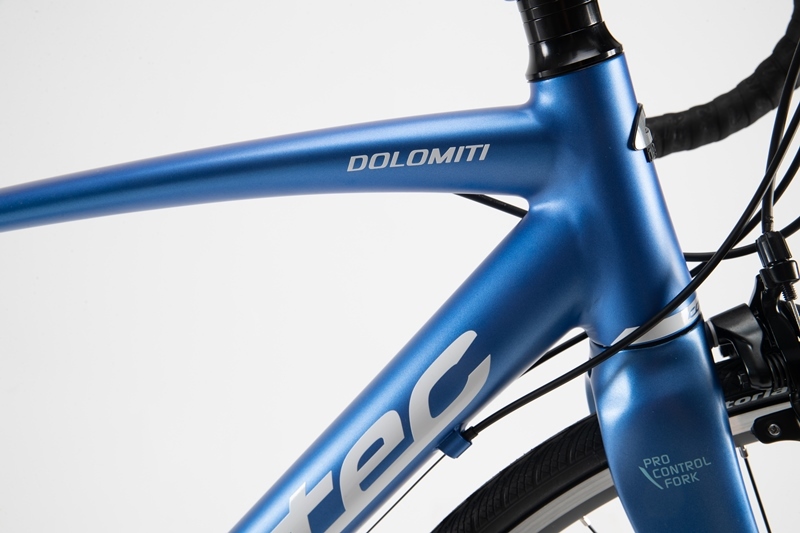 この車体ではフレーム素材にアルミを使用しています。トリプルバテッドと言われる内部で厚みを変える技術により、乗り心地、剛性、軽量性をバランスよく兼ね備えています。また、各部の溶接痕がきれいに処理され、まるでカーボンロードのような美しい見た目になっています。