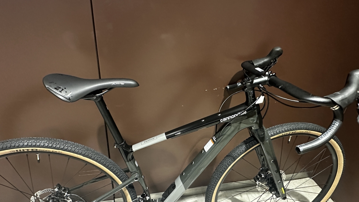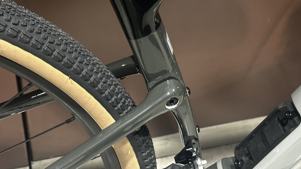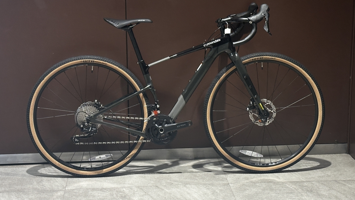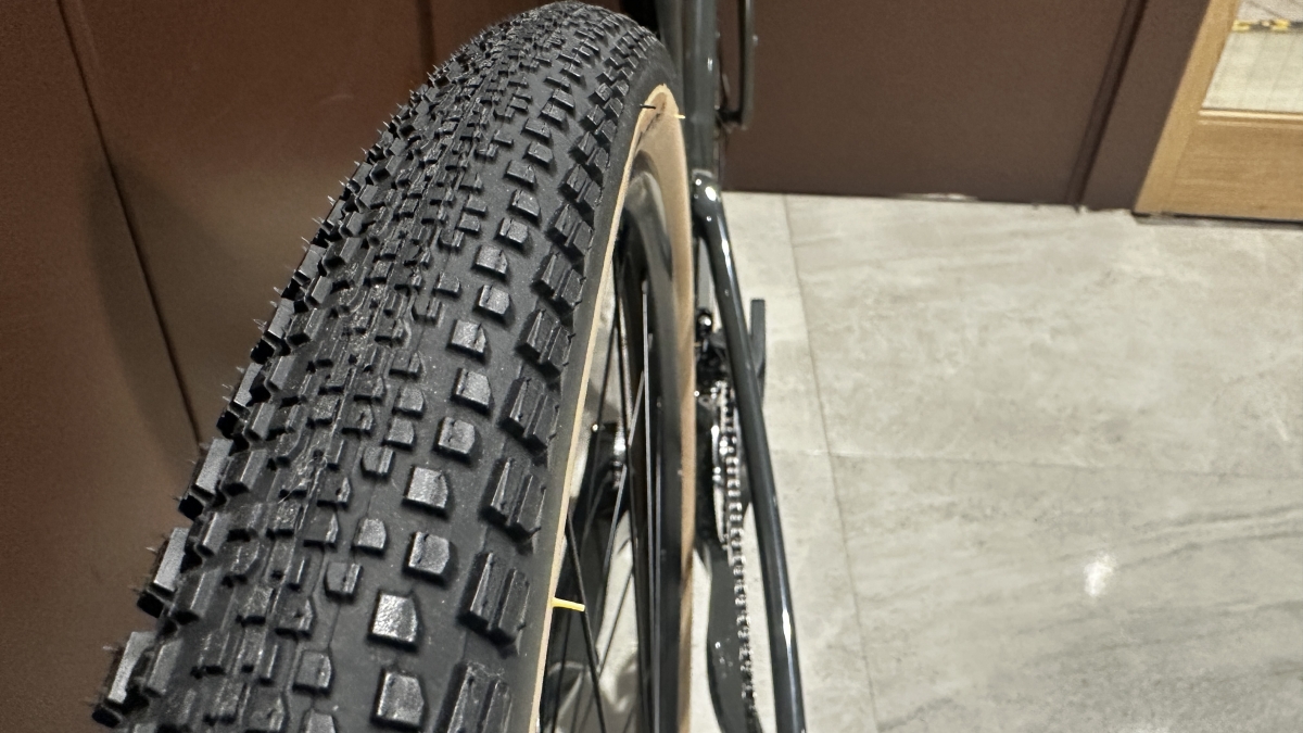 グリップのいいブロックタイヤで走破性を高めたカーボングラベルロードです。45Cのタイヤがアセンブルされています。リムはチューブレスレディ対応ですが、今回のタイヤはチューブレスレディではありません。