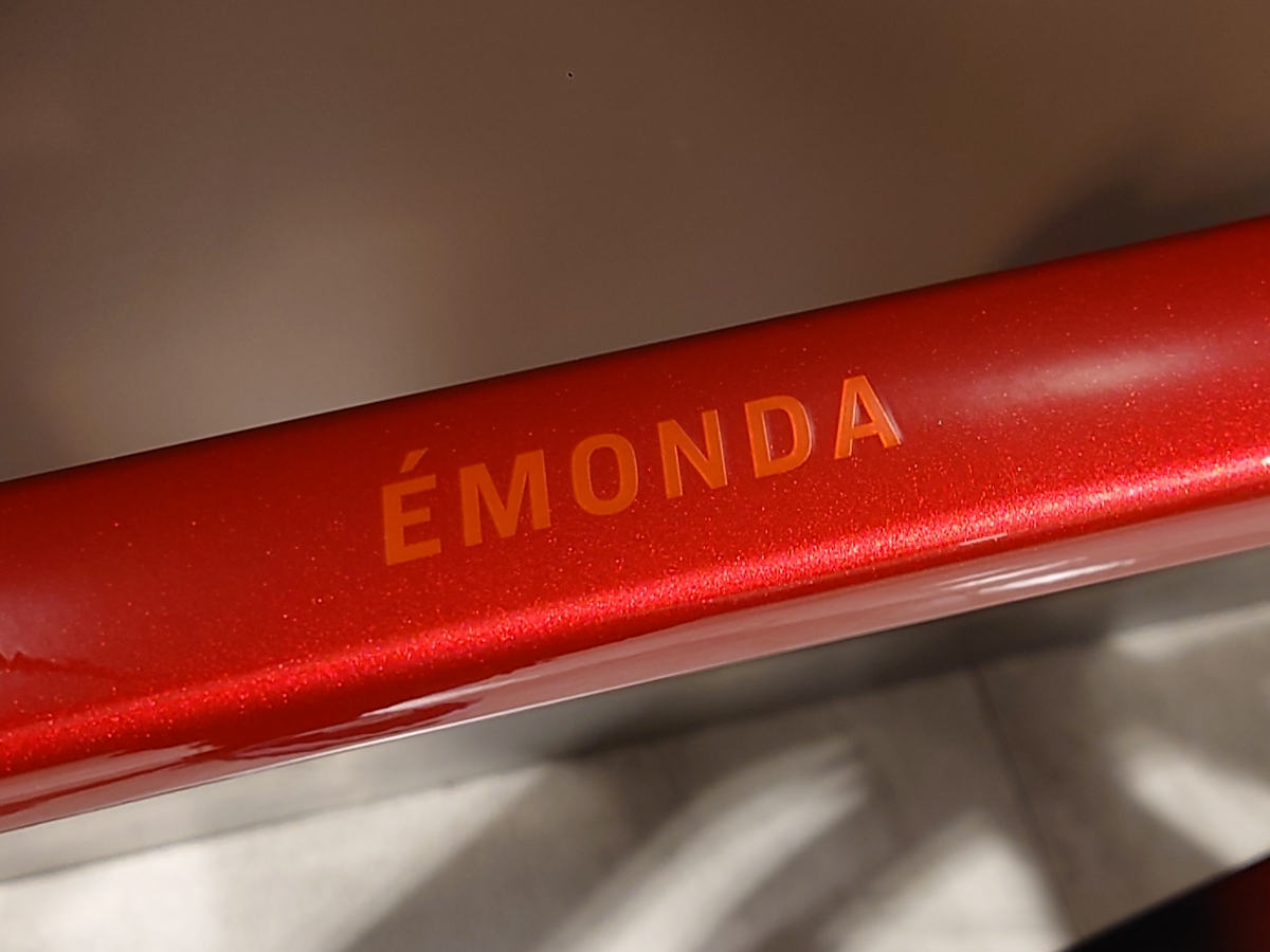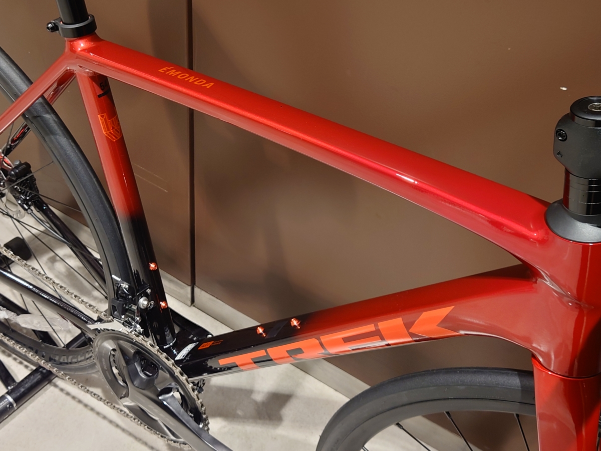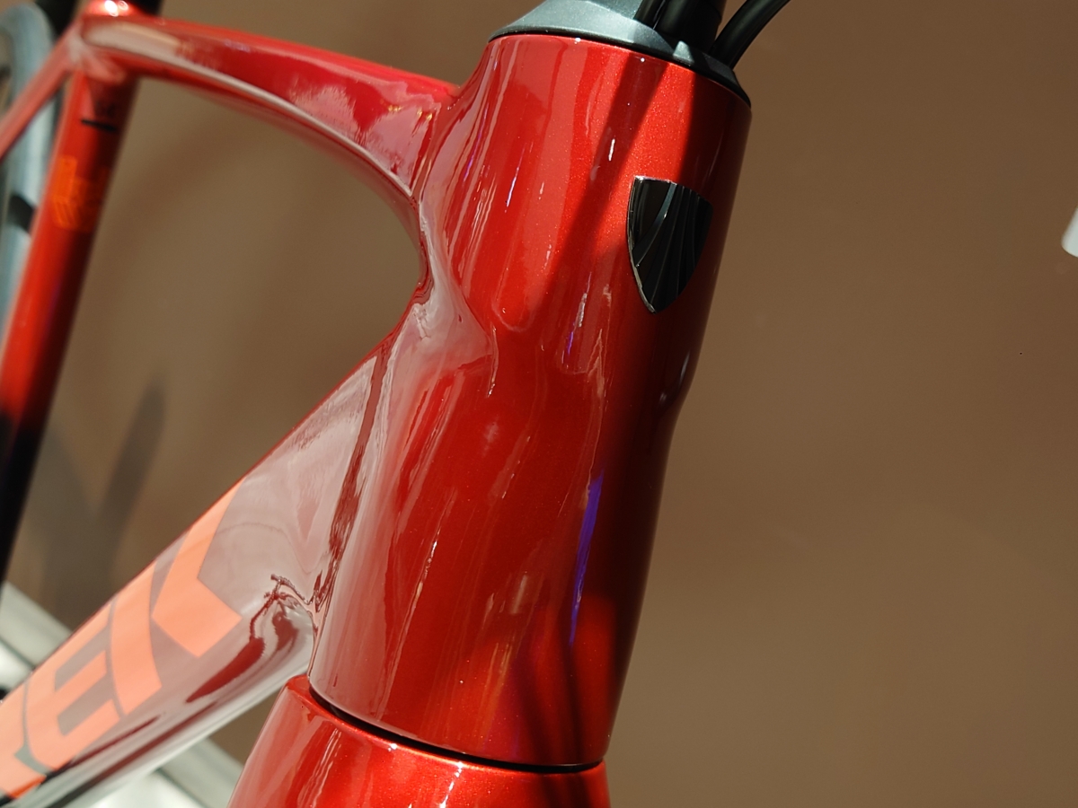 カムテール形状を採用したアルミパイプや、ヘッドチューブ周りのカーボンと見まがうほどの美しい溶接面も空力性能に一役買っています。