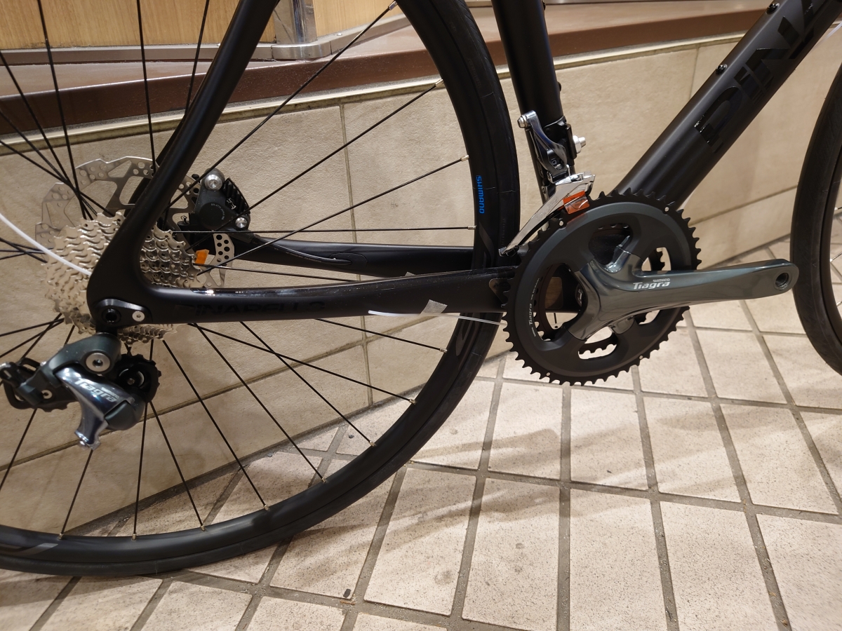 SHIMANO TIAGRAを搭載。前2速、後10速の20段変速です。レーシンググレードの105の1つ下のグレードですが、サイクリングであれば十分な変速性能を持ちます。