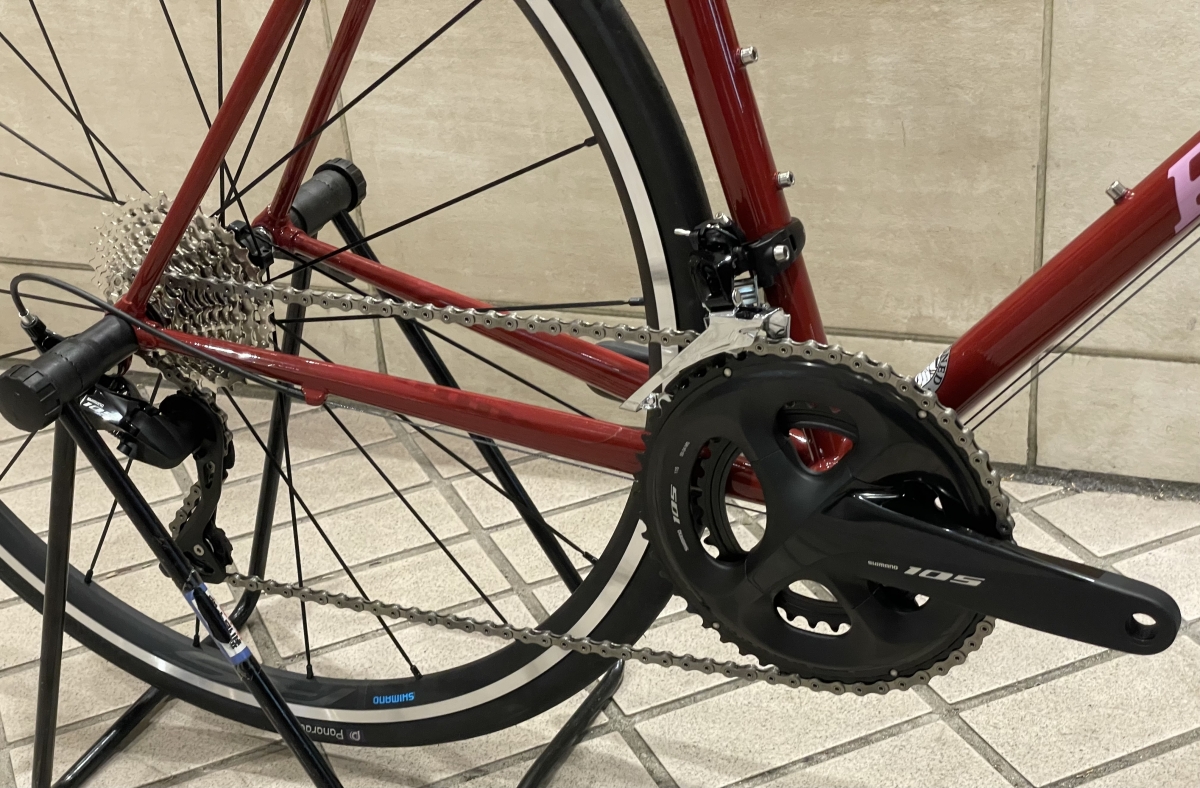 コンポーネントはShimano 105、フロント2段、リア11段。シマノの上位グレードですので変速もきびきび動いてくれます。