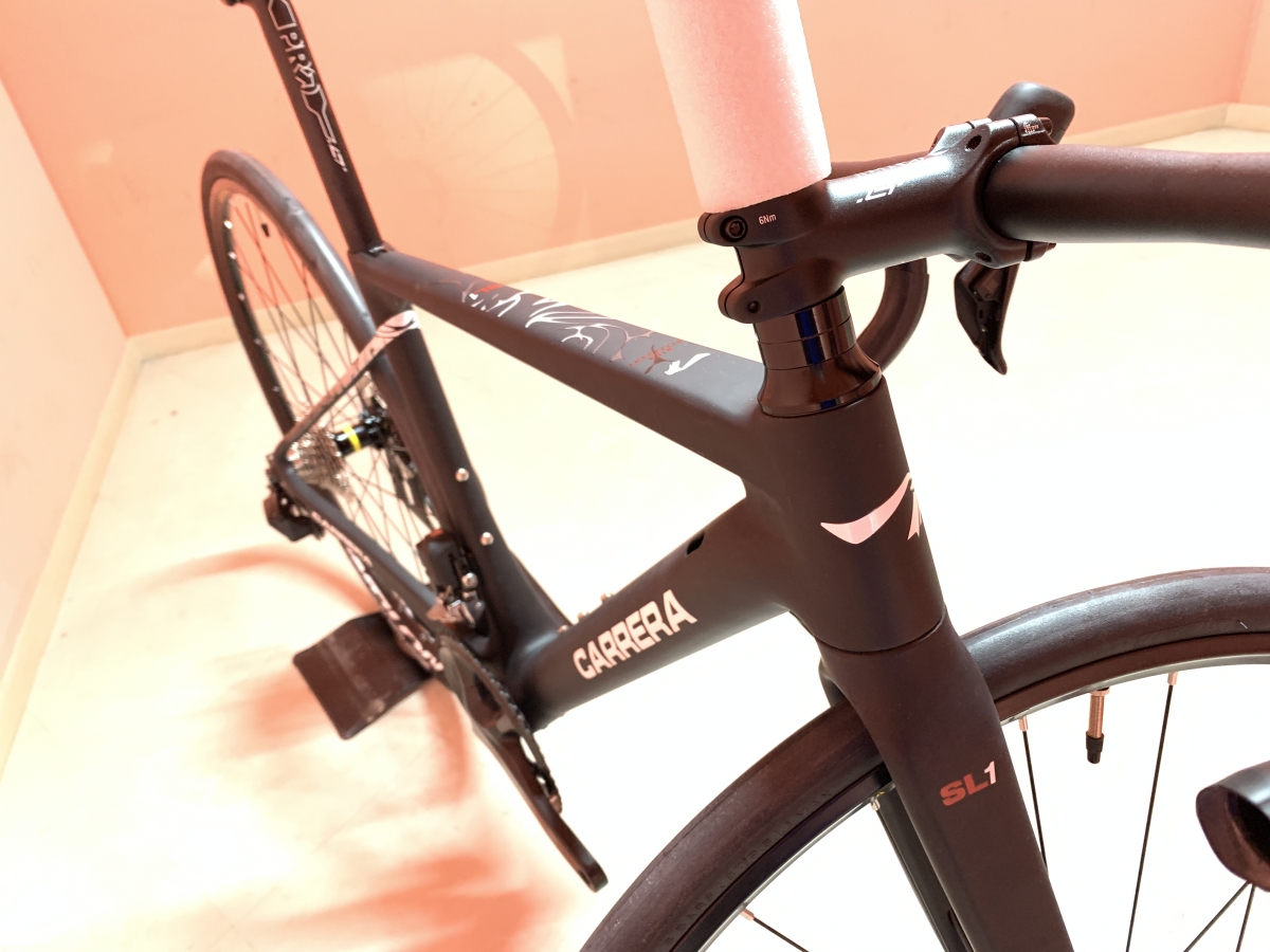 心地よい乗り心地と素直なカレラらしいハンドリングを生み出すカーボンフォーク。そこにマヴィックのアクシウムを搭載。重量こそ1900gあるものの、元リム屋さんのマヴィックらしい軽量リムに、最上位グレードにも使われる機構、ID360を搭載するハブは「走ると軽いマヴィック」という言葉が納得できるホイール。