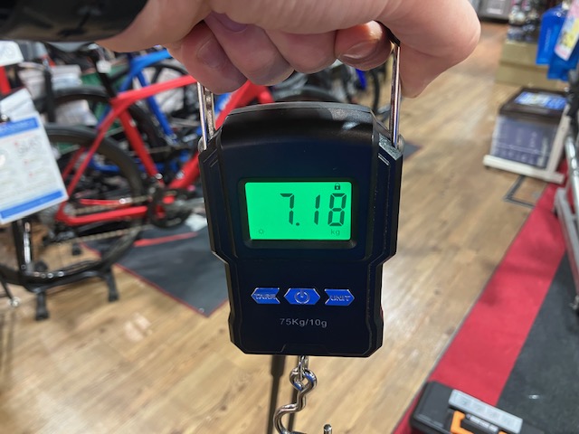 気になる重量はサイコンマウント込みバーテープ無しで7.18kgをマーク、セカンドグレードながら非常に軽量。