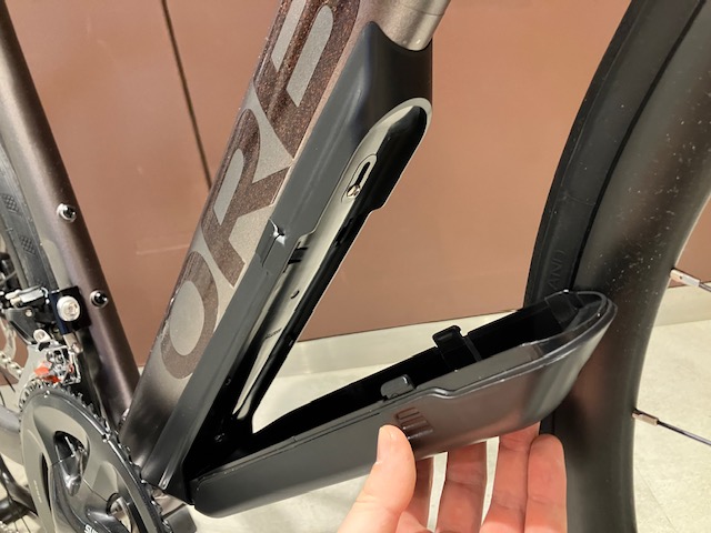 ダウンチューブ下部には専用のストレージボックスも装備。替えチューブやバンク修理材、携帯工具などをスマートに収納可能です。取り外し可能ですので、軽量化したい方やシンプルに仕上げたいお客様でも安心です。