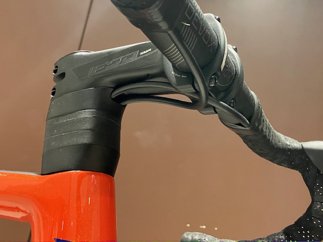 ハンドル周りはフル内装に対応しケーブルによる空力のディスアドバンテージを解消しています。完成車仕様ではFSAのSMRを採用しセミフル内装とすることで整備性も良好です。