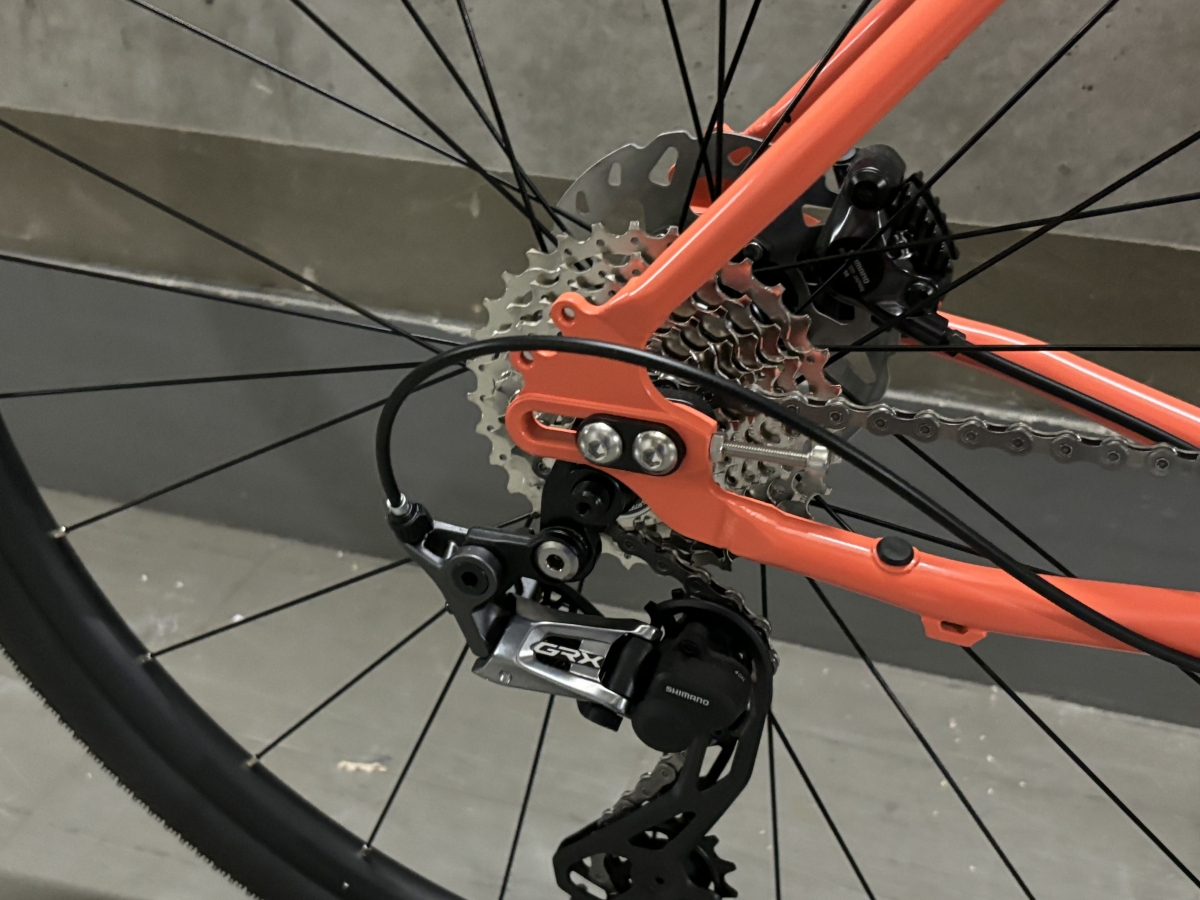 この第二世代のD604はスライドエンドになっております。シングルスピードにカスタムするハードルはかなり低くいです!テンショナーを使わないシングルスピードは漕ぎ味にダイレクト感があって、乗っていて気持ち良いです。わざわざ変速を無くすのなんて、、、、って思うと思いますが面白いのでやってみてください!!自転車って面白いなって思ってもらえると思います。シングルスピードのシンプルさと、不自由を楽しむって感覚にハマってもらえると思います!(ちなみに、スライドエンドのグラベルバイクって結構珍しいので変わったカスタムをしたい方にもオススメ)
