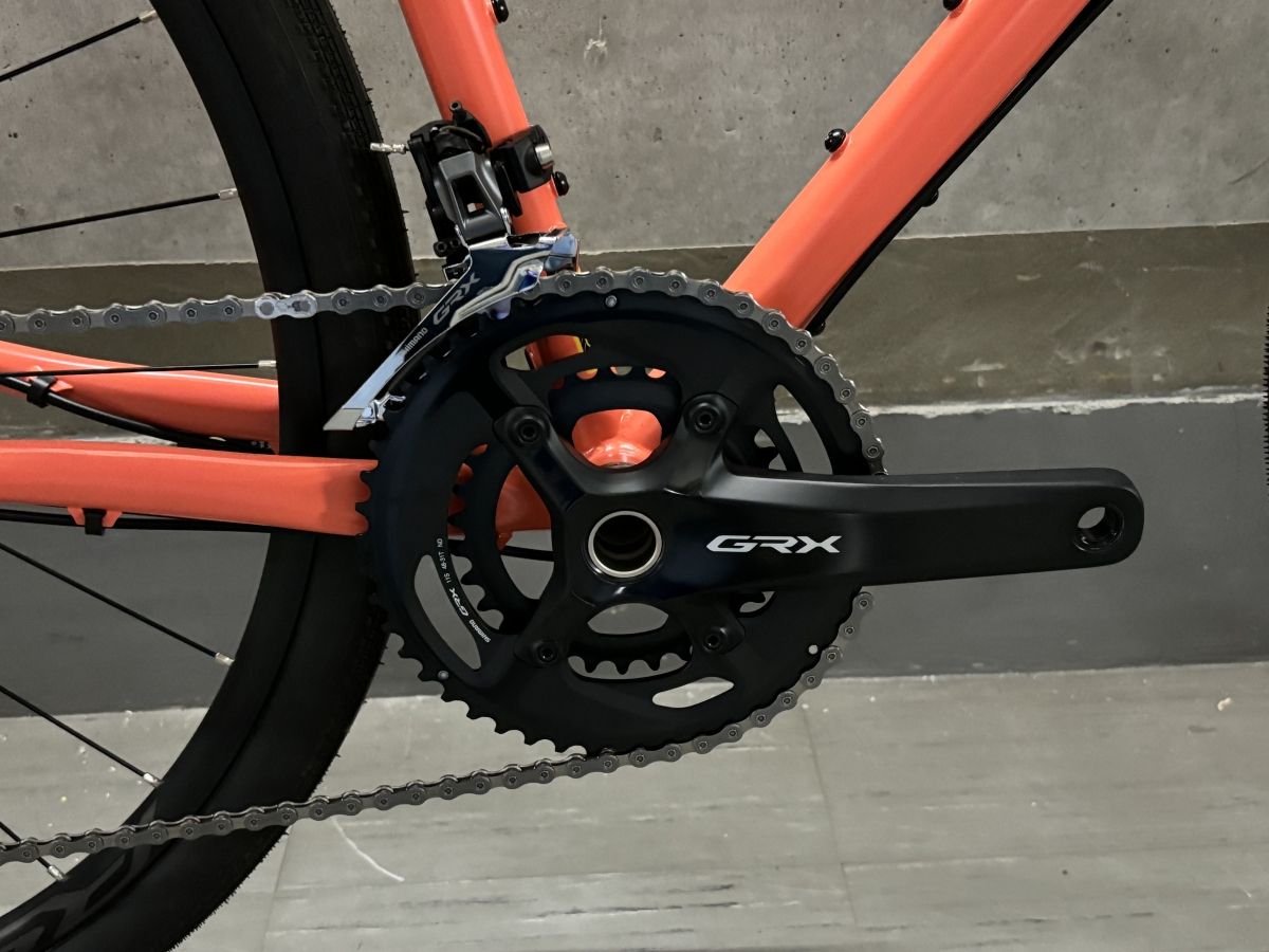 コンポーネントはShimano GRX 2×11です。800番台のグレードで構成しています。コンポーネントって後から、乗せ換えるとなかなかハードルが高いと思いますので、最初から納得のいくものが付いていると嬉しいと思います!このグレードのGRX、使いやすいしシンプルに調子良いですよ!