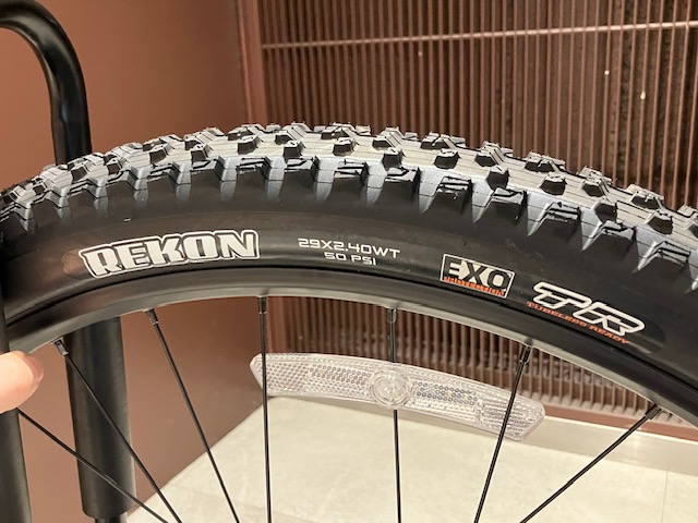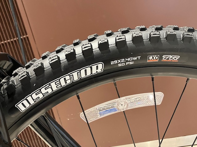 前後ともチューブレスレディのホイールとタイヤがアッセンブルされており、リアタイヤは定番のMAXXIS REKON 2.4インチ、フロントにはより高いコントロール性とグリップ力を持ち走行抵抗も低いMAXXIS DISSECTOR 2.4インチを採用しています。