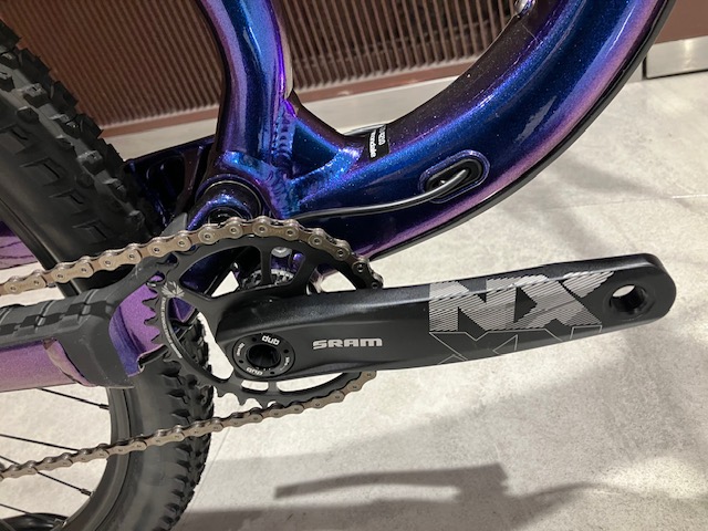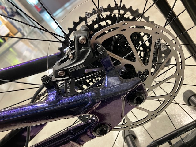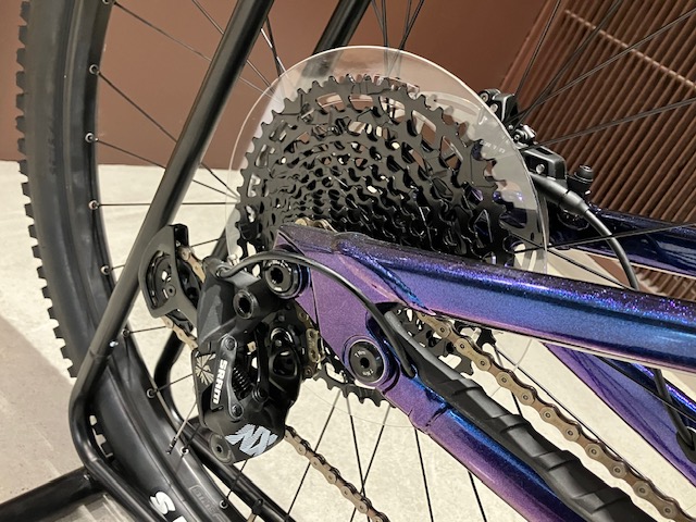 メインコンポーネントはSRAM NX EAGLE、フロント30Tリア10-50Tの1×でギア比は3から0.6のワイドレシオ。4対向ピストンの高剛性キャリパーと前後180mmのローターが絶大なストッピングパワーを発揮します。