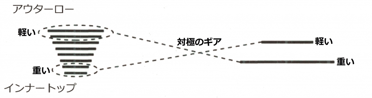 前後のギアの重さが対極の組み合わせ 2 つを“クロスギア”と呼び、ギアがねじれることから走行中はこの組み合わせにしないことが推奨されています。前のギアを変速したときに自動で後ろのギアを変速してこの組み合わせを避けます。