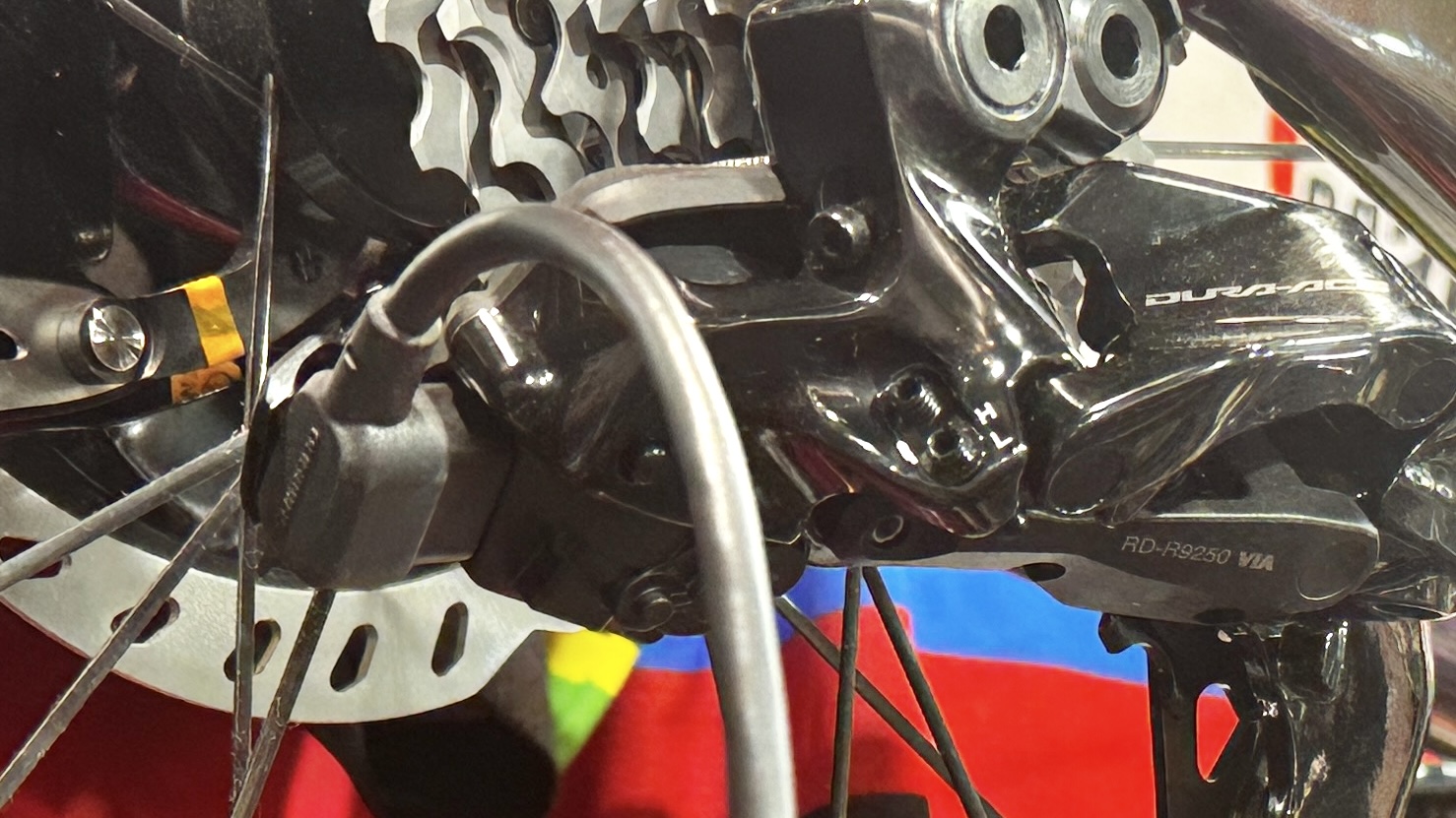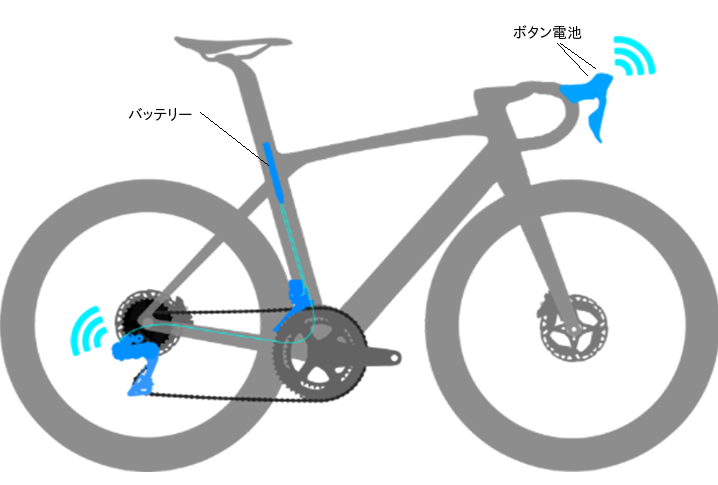 メカニカルブレーキ式 Di2 の場合は前後の変速機と左右のシフトレバーが全てバッテリーと有線で繋がれます。