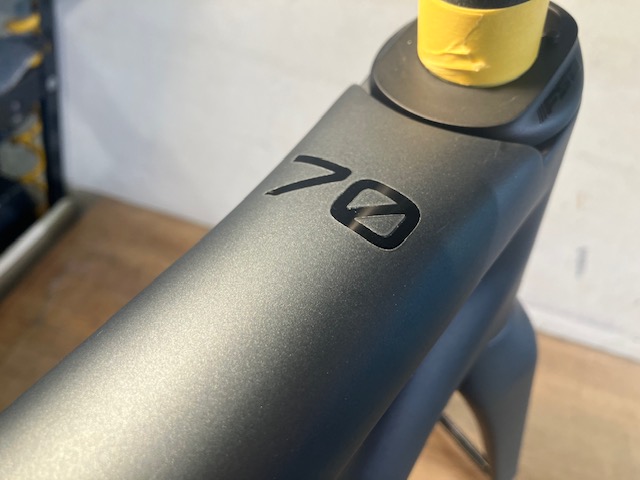丸みを帯びたトップチューブの上面には創業70年を象徴する70(イタリア語でSETTANTA)のペイント。ヘッド周りは汎用性の高いFSAのACRに対応しているのでパーツの選択肢も幅広いです。