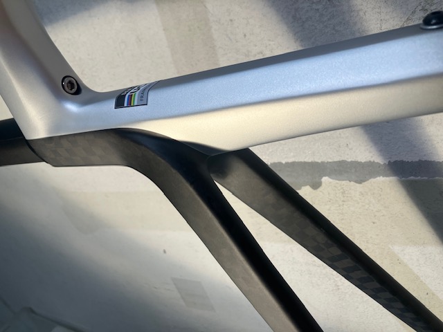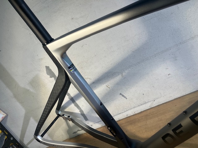 シートステーは縦に大きく扁平したチューブに水掻きのようなブリッジが配された複雑な形状をしています。外観から分かる通り後部には織目の大きい12Kカーボンを、前に行くにつれ軽量で高剛性な1Kカーボンに材質がシフトしていくそうです。