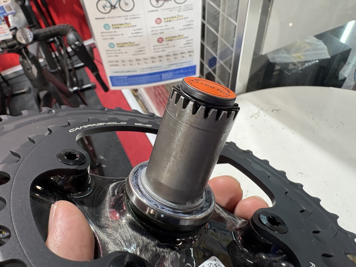クランクスピンドルはチタン製となっており軽量化と剛性に貢献します。取り付けてしまえば見えなくなってしまう場所ですが、チタン特有の鈍い輝きがマニア心をくすぐります。