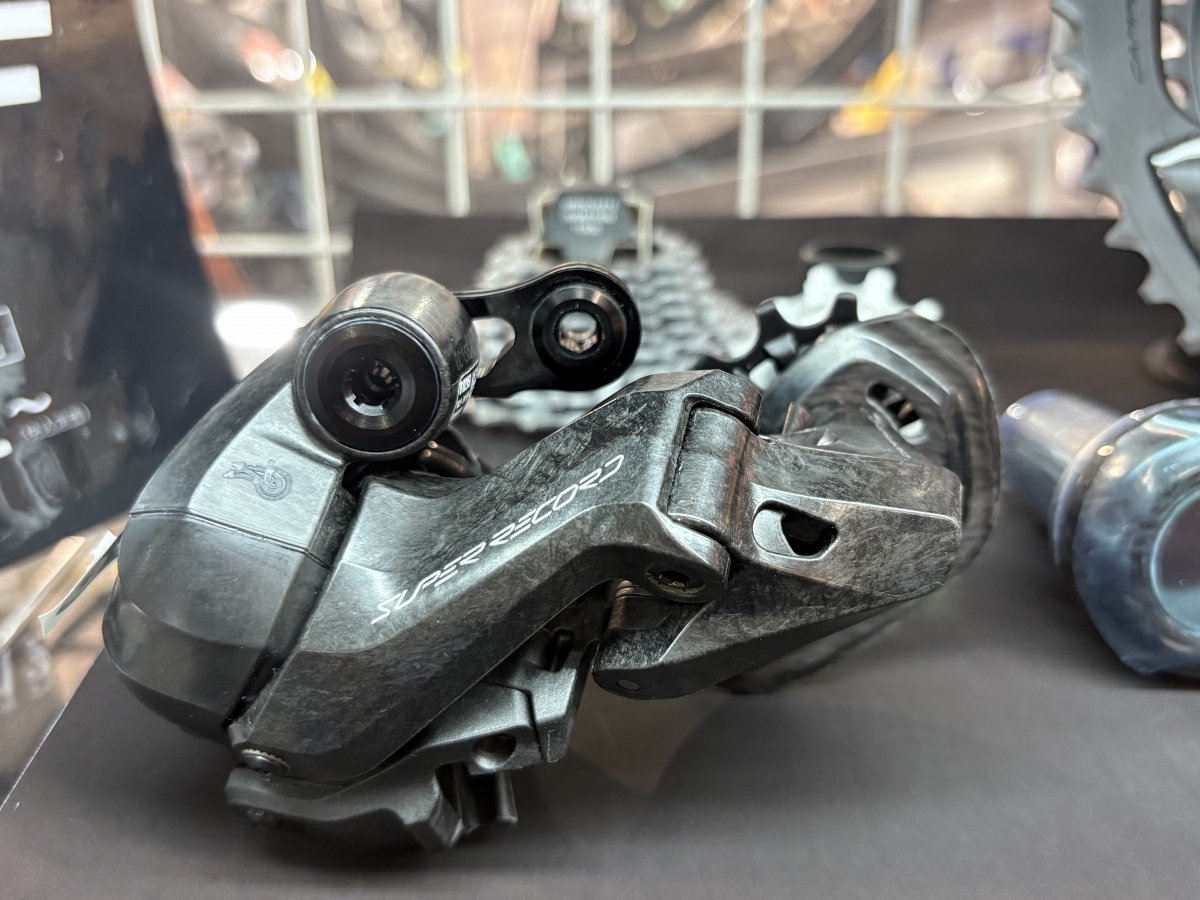 クランクやレバー、RD、FDなどカーボンのパターンが透けて見える、カーボンの美しさが楽しめるコンポーネントとなっております。見た目の高級感はさることながら、手に取った時の質感やボタンのクリック感など五感で楽しめるポイントがSUPERRECORDならではの楽しみ方なのではないでしょうか。