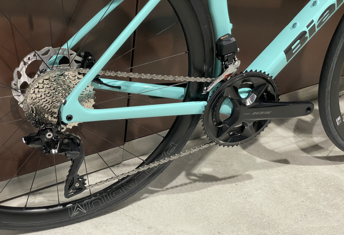 コンポーネントはShimano 105 Di2。電動変速ですので指先で軽くスイッチを押すだけで素早く確実に変速してくれます。ヒルクライム中の余裕がないときにこそ活きてきます。またリアのシフト操作だけでフロントの変速を自動化してくれるモードもございます。