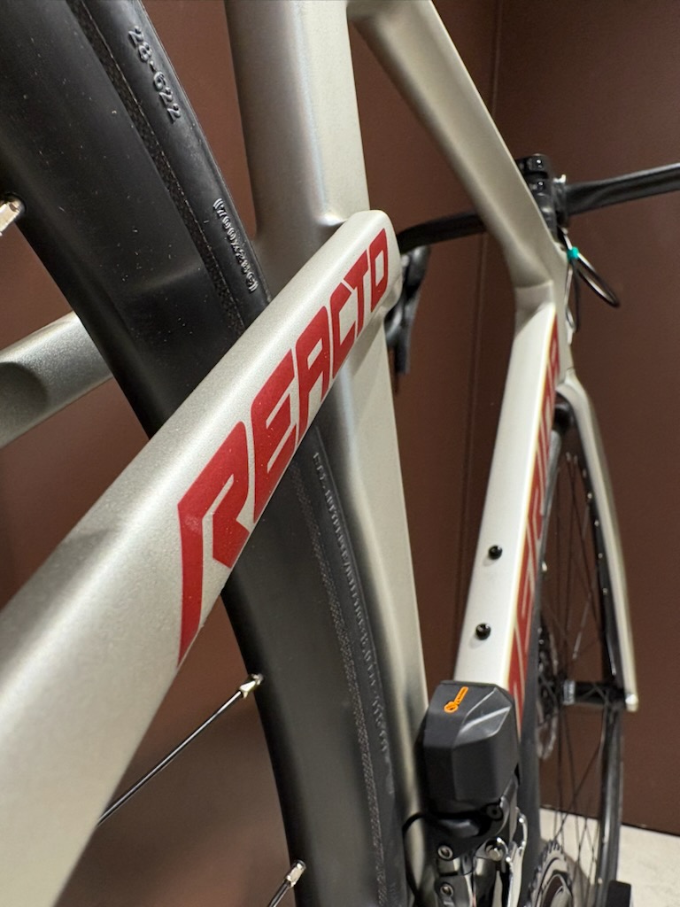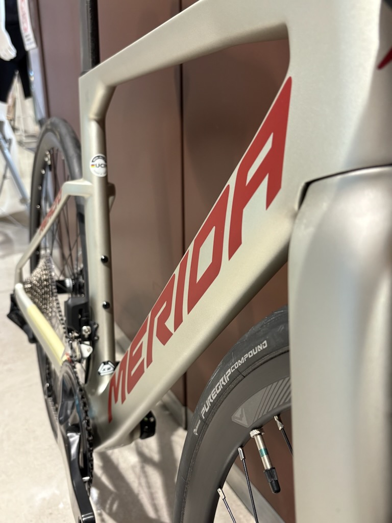 まずREACTO 6000の説明をさせていただきます!まずREACTOというのは、皆さんご存知の通りMERIDA のエアロバイクシリーズになります代表的なのがプロも使っているREACTO THEM-Eですね、REACTO 6000シリーズはTHEM-Eのジオメトリーとおんなじで作られています、なので空力だったり乗り心地も申し分ないと思います。ならTHEM-Eとの違いはない?と思うかもしれませんが決定的な違いは勿論あります、それはフレームのカーボン素材の違いです。THEM-Eの場合は上位グレードのカーボンを使っており、剛性が高く作られています、これはプロとかも使うためにレースに特化した乗り方に合わせて作られているからであり、それに対して、6000は、カーボンフレームに初めて乗る、ロードバイクに初めて乗るという方でも乗れるように下位カーボン素材を使い乗りやすく作られています!