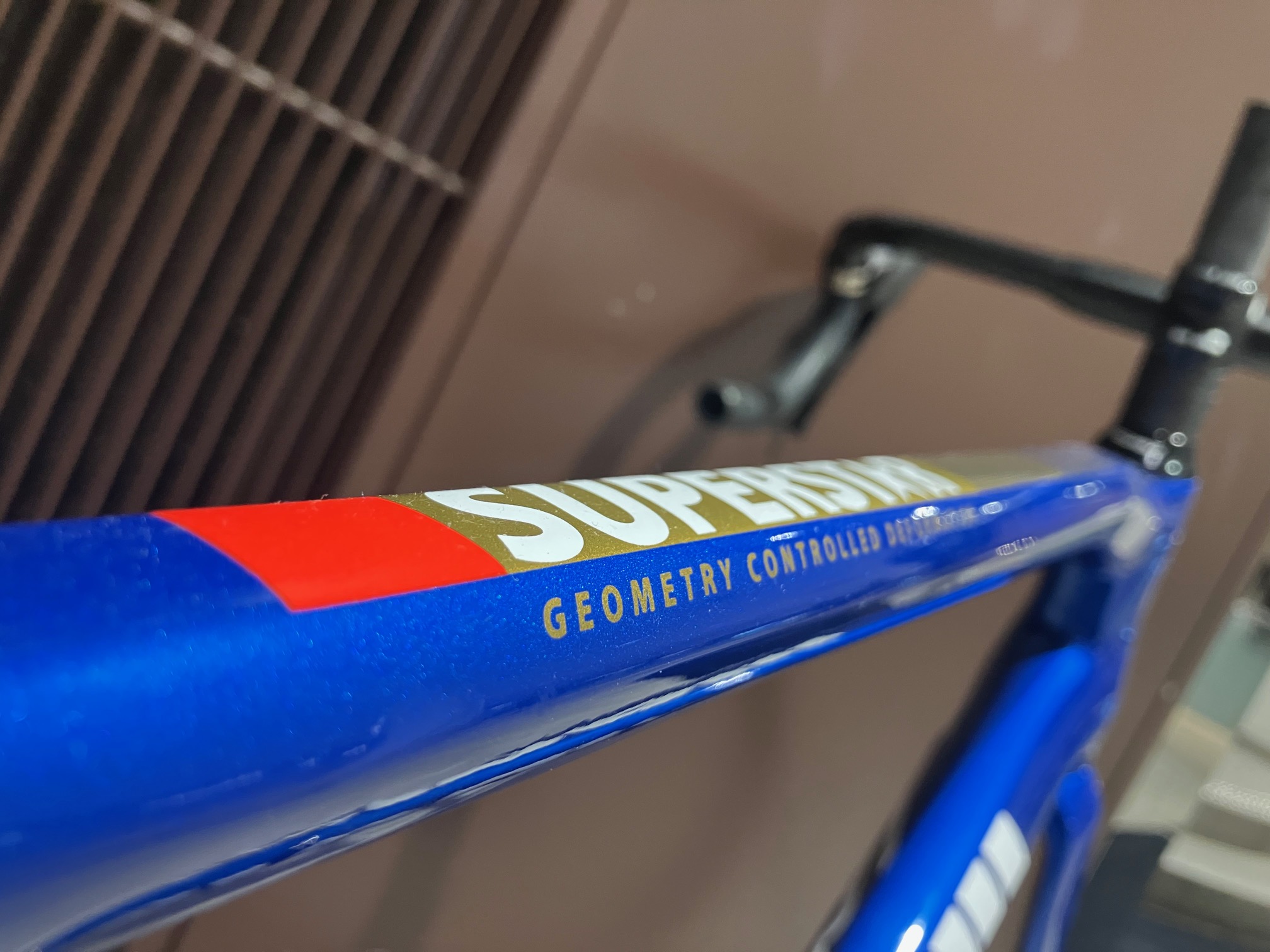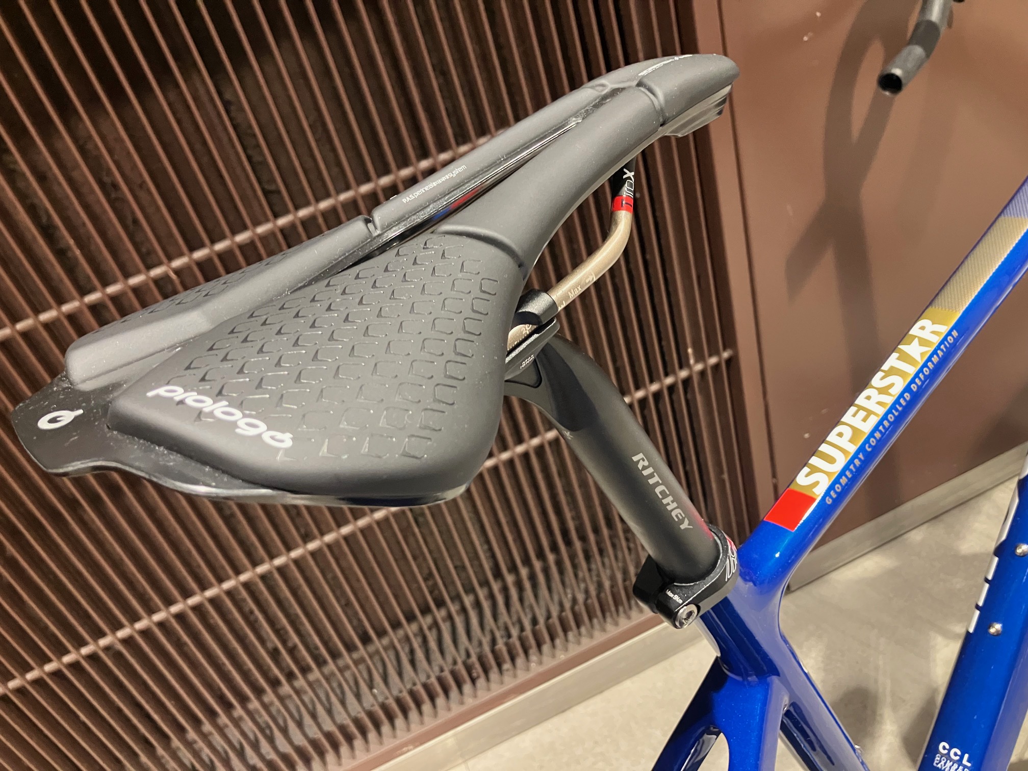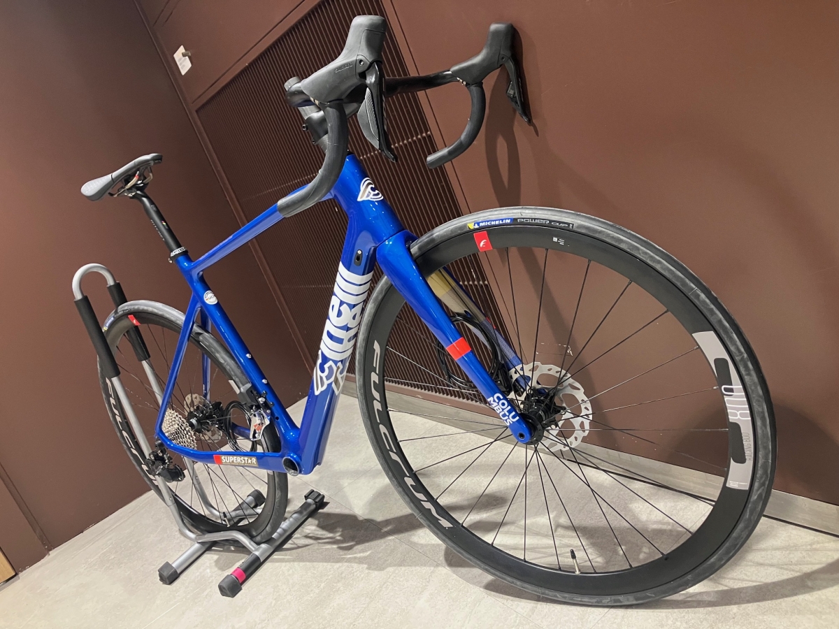 二台目は同じくスーパースターのディスクモデル。メインコンポーネントには最新の105Di2を採用しホイールも剛性感高めのフルクラム、サドルはスクラッチM5と先程の車体とは打って変わってレーシーな印象に。基本形状は同じですが細部がディスクブレーキに最適化されておりカラーリングも異なります。