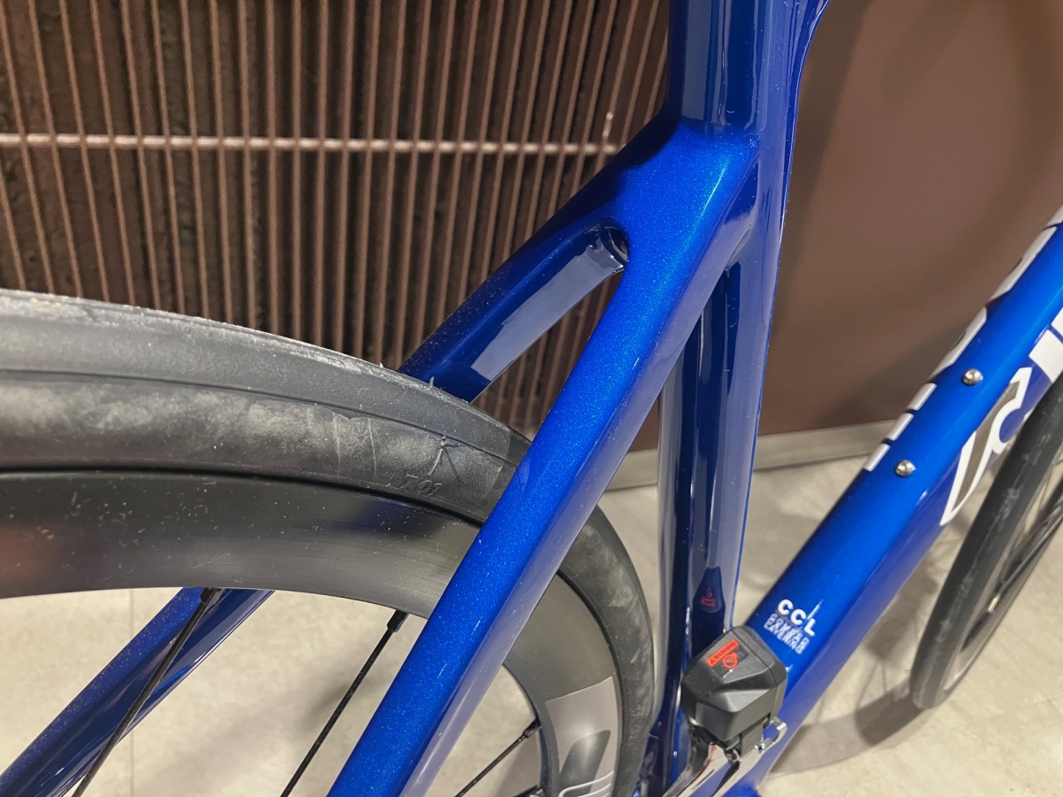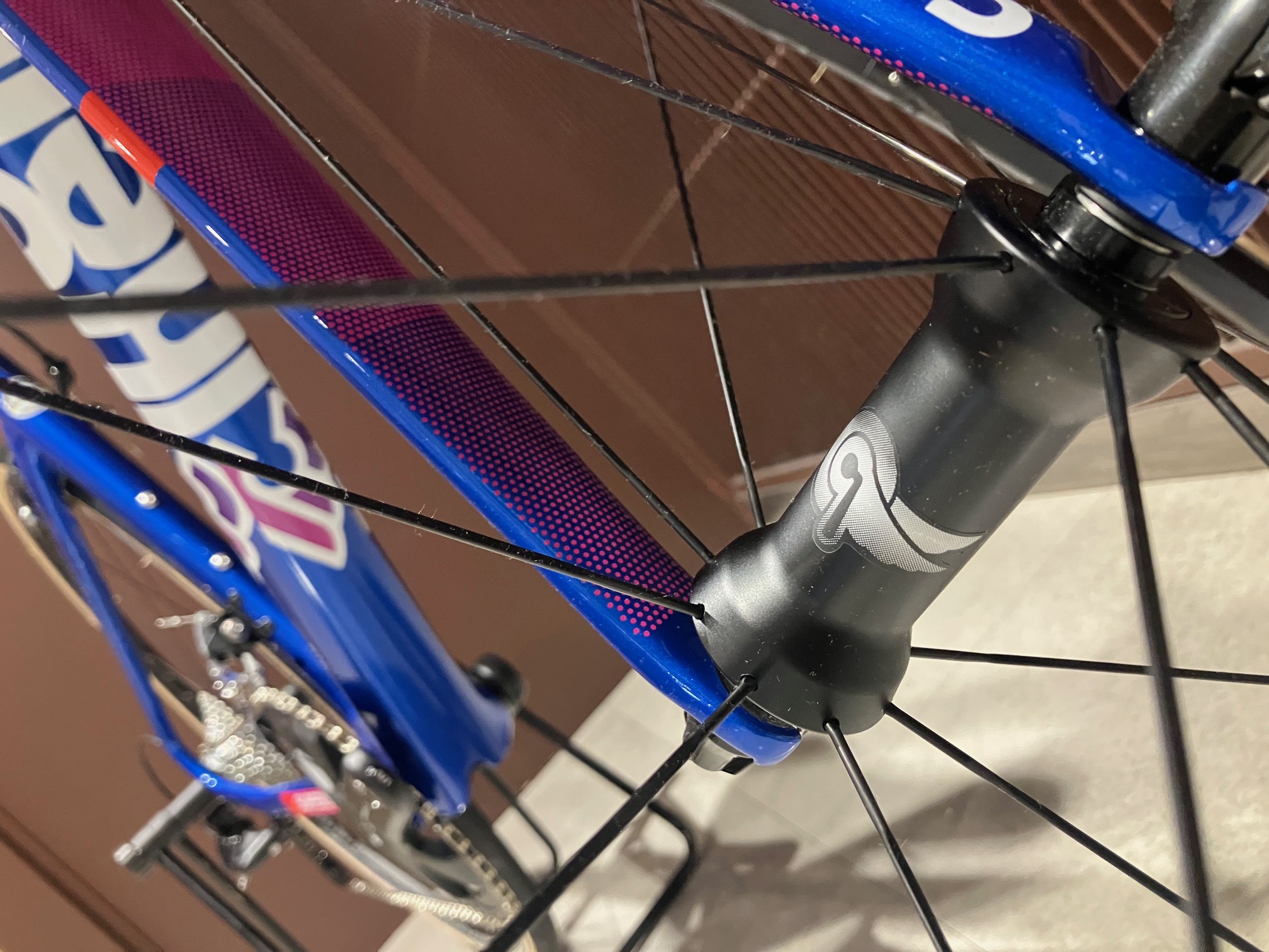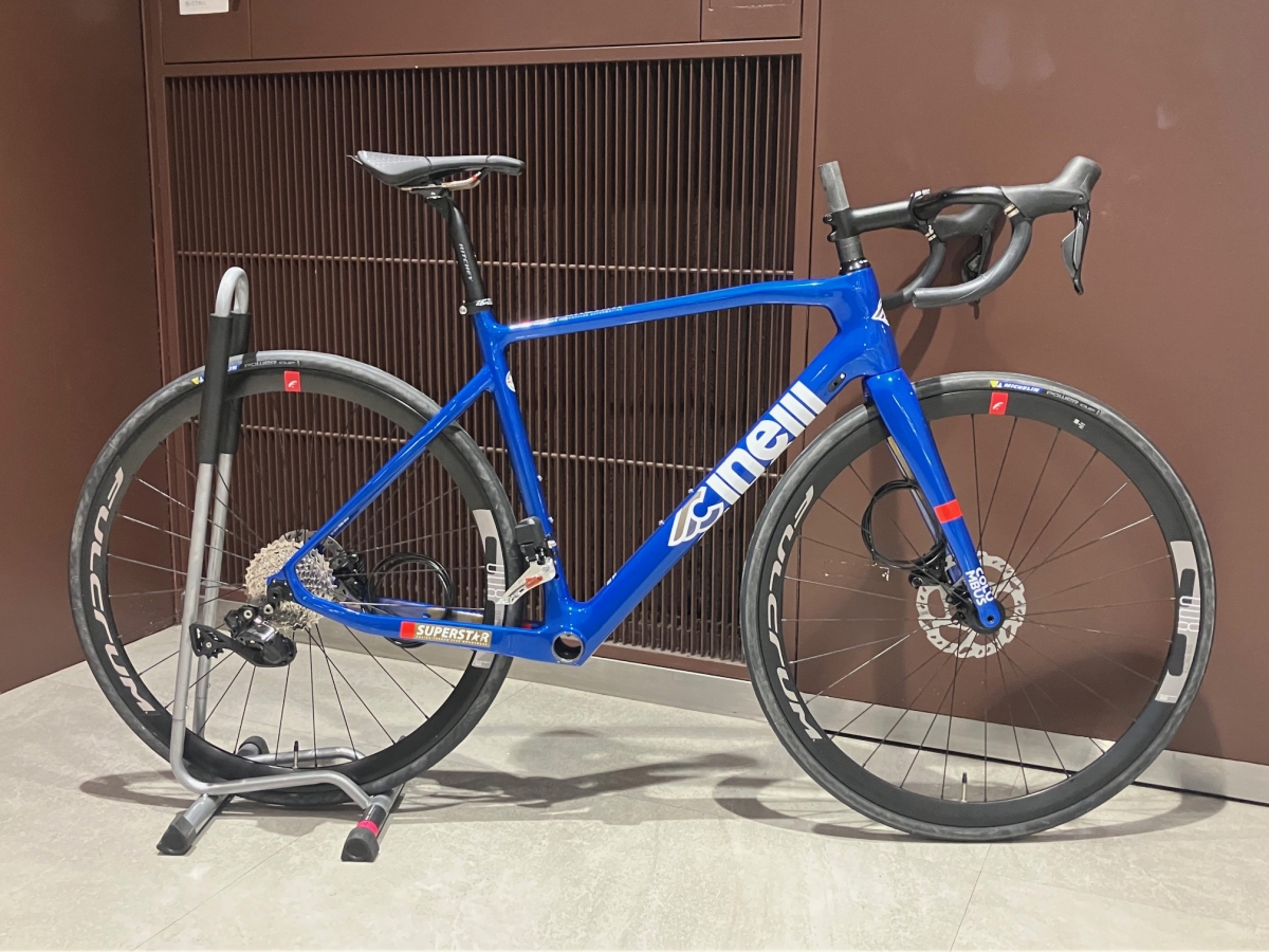 二台目は同じくスーパースターのディスクモデル。メインコンポーネントには最新の105Di2を採用しホイールも剛性感高めのフルクラム、サドルはスクラッチM5と先程の車体とは打って変わってレーシーな印象に。基本形状は同じですが細部がディスクブレーキに最適化されておりカラーリングも異なります。