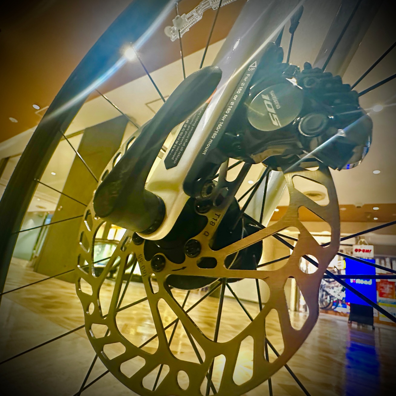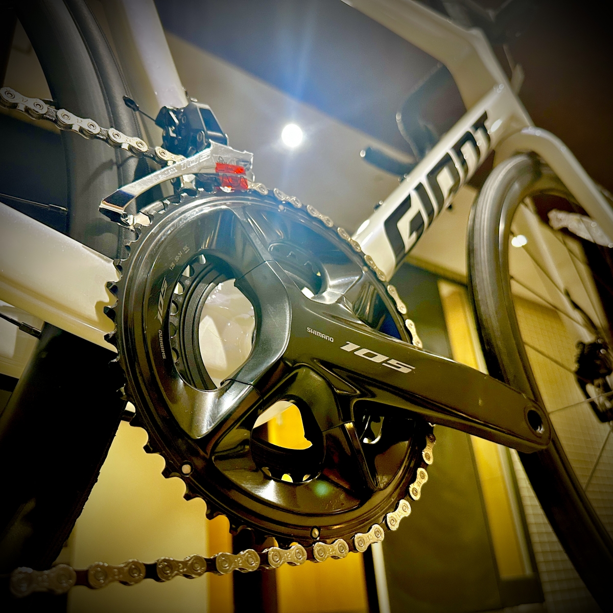 そんな優秀なフレームに組み込まれるのは最新のSHIMANO 105、2×12-speed。KOM、キングオブマウンテンの名を恣にする フロント50-34T×リア11-36Tのギアレシオ。より軽いギアに入れられる構成です。