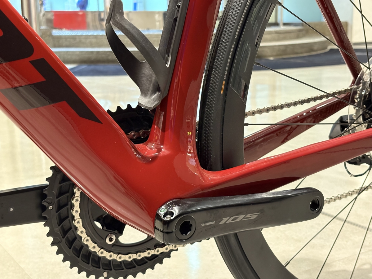 そしてこの太いフレームにBB周り!写真だけでも剛性の高さが伝わるのではないでしょうか!更に専用のエアロボトルケージも付属します!コンポーネントに関しましても、105の12sのものが付属しております!最新のコンポーネントにエアロロードの組み付けは最高ですね!