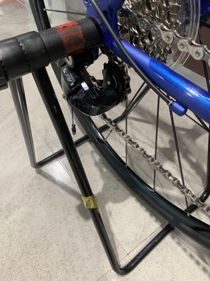 フレーム以外のパーツは黒で統一されており落ち着いた趣があります。ホイールも黒になっていてエアロスポークを採用。レーシーかつシックな仕上がりとなっています。