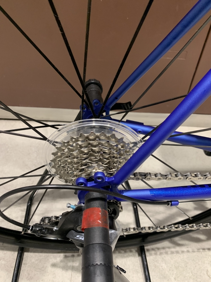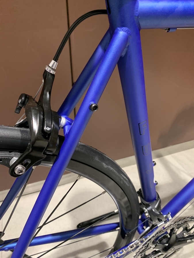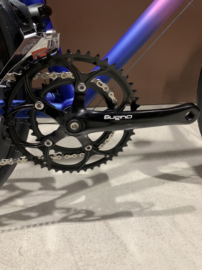 SHIMANO SORA9速をメインコンポーネントとしており、フロントクランクは日本のSUGINO製クランクで2×9の18段変速となっています。ギア比はフロントクランクが50-34T、リアのスプロケットが11-28Tです。