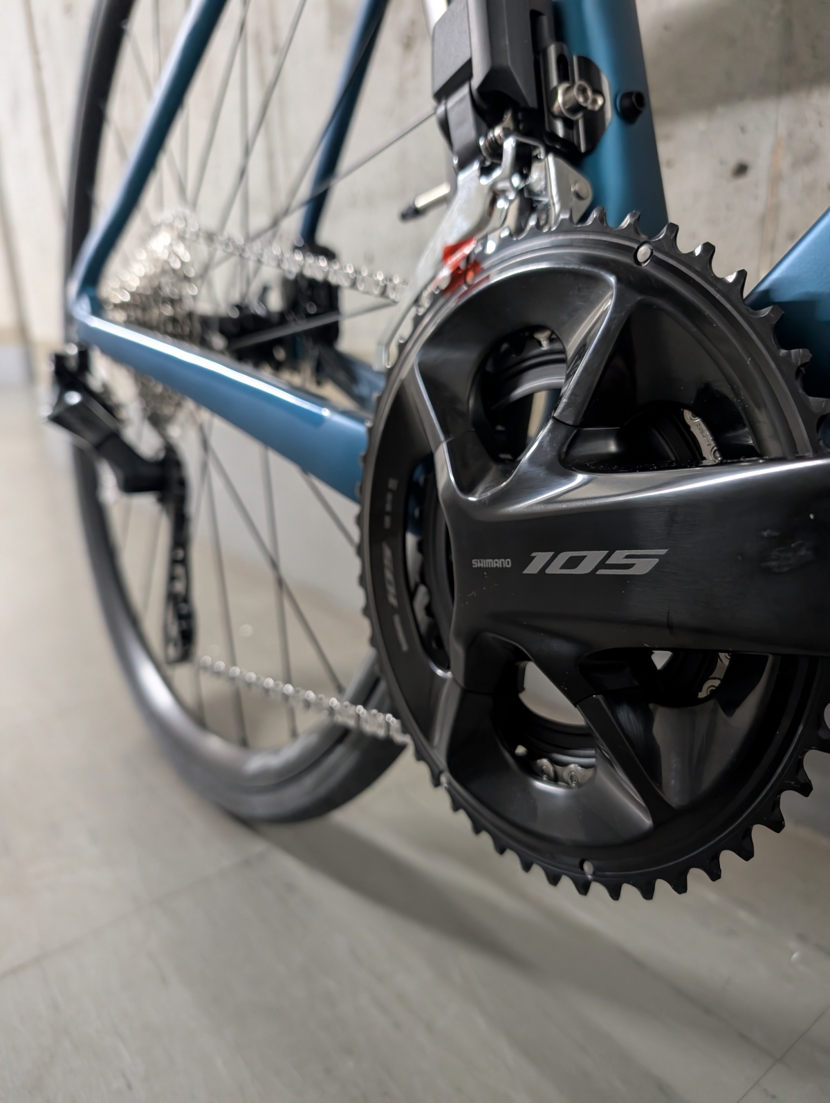 コンポーネントは105Di2をアッセンブル。金額を抑えつつ、レースでも問題なく使えるものになっています。
