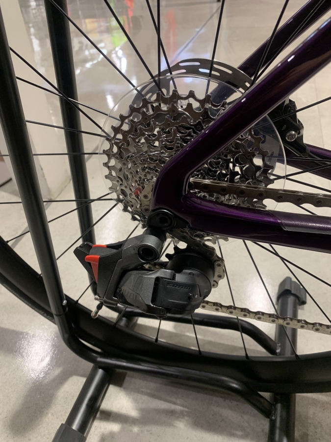 SRAMの12速eTap(電動変速)を搭載!シマノ、カンパニョーロとの大きな違いは、ワンレバーで操作するといった点です。直感的な操作が可能なので、これに慣れると他社製品が使えなくなる人もいるみたいですよ!