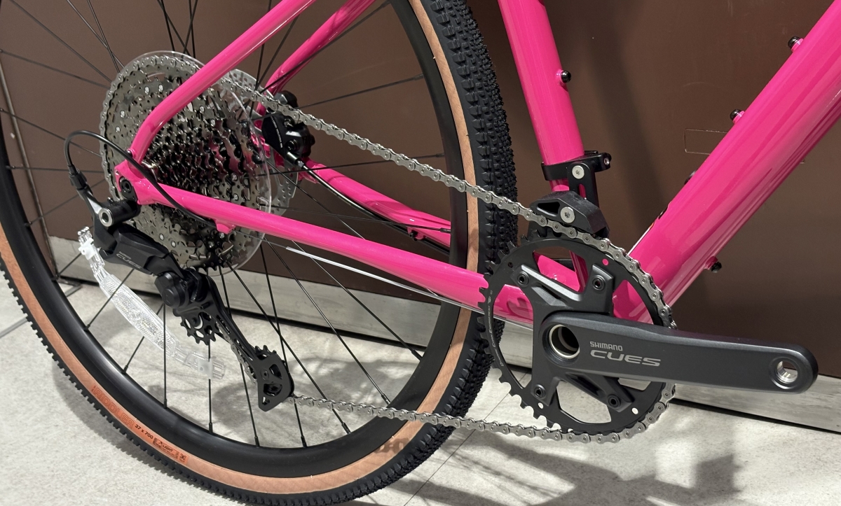 1×11のShimano CUESにチェーンガイドも搭載、タイヤも37Cと砂利道でも安心して走行できますね。