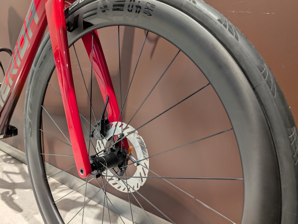 まずはホイールの紹介です。前後合わせて1400gと軽量で、特にエアロ性能に優れていて高速巡行性には定評があります。万能な性能で、フレームと相性抜群なホイールです。