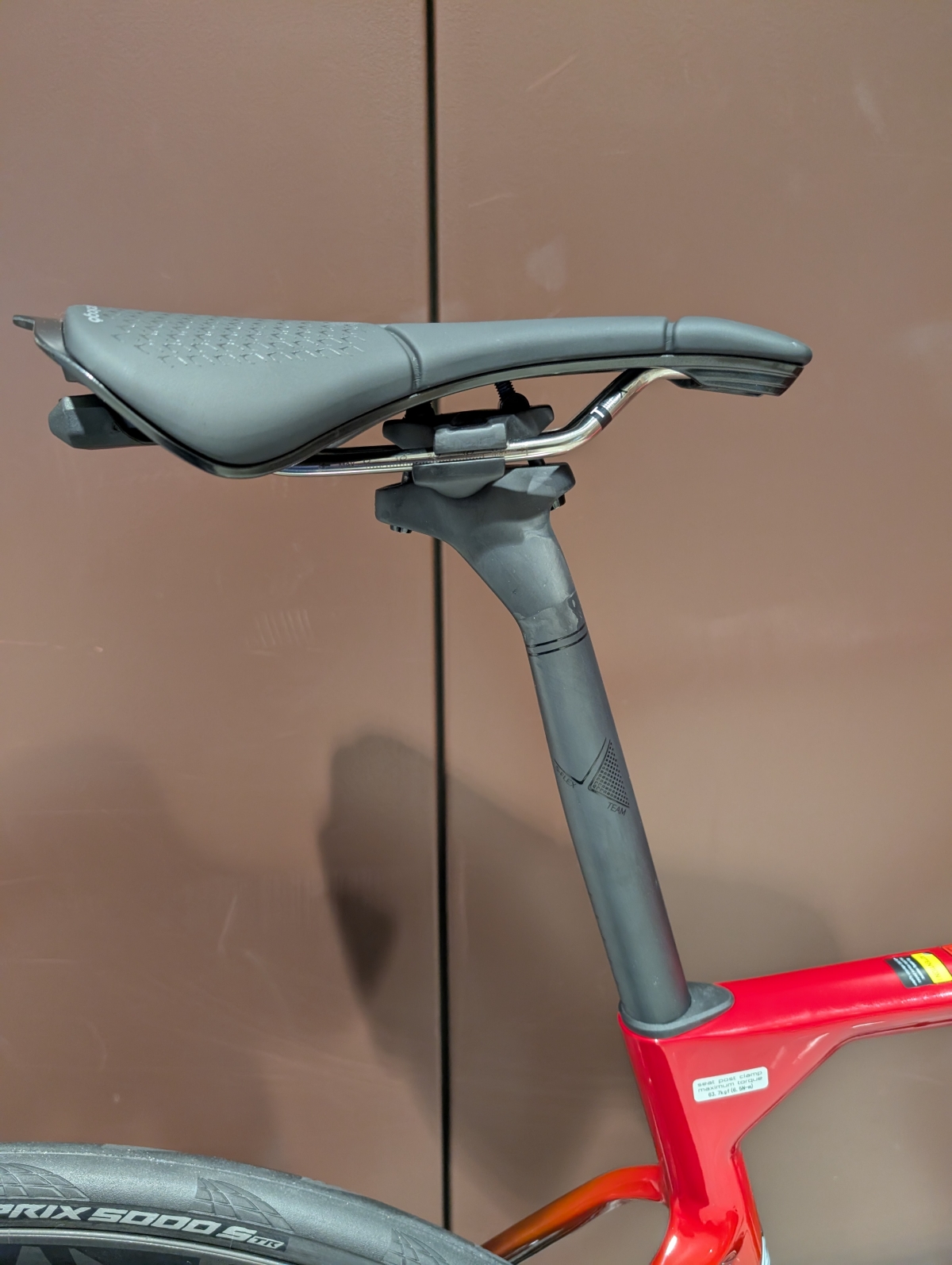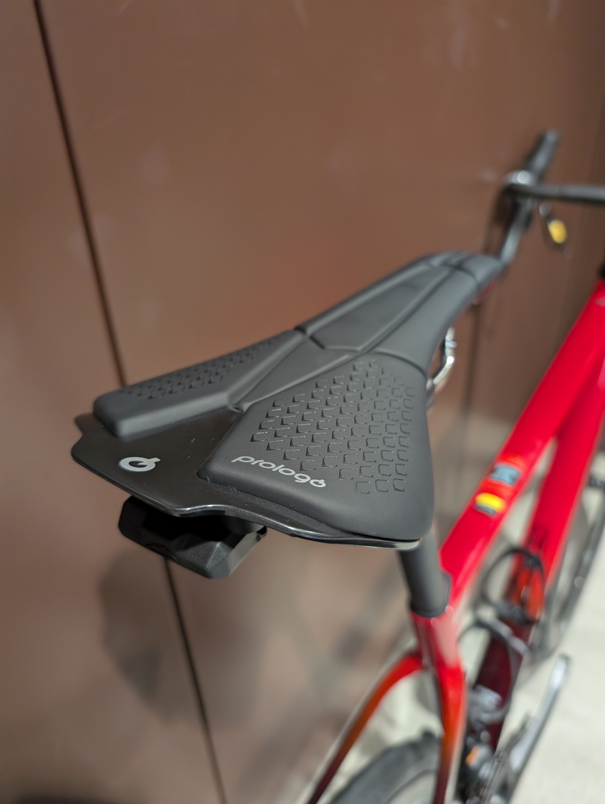 サドルはPROLOGO SCRATCH M5でプロ選手もレースで使う本格的なサドルです。軽量で剛性が高く薄いので硬い乗り味です。また考えられた形状で多くの方にフィットしやすいサドルでもあります。さらにS-FLEXシートポストが採用されており、快適性に優れていながらフルカーボンなので軽量性も持ち合わせたものになっています。