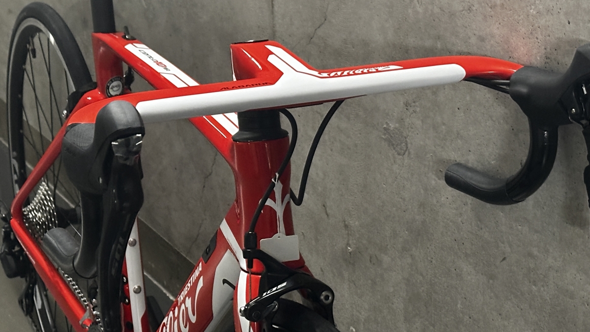 車体と同じコントラストでカラーリングされた朱色のステム一体型カーボンハンドルが付属します。