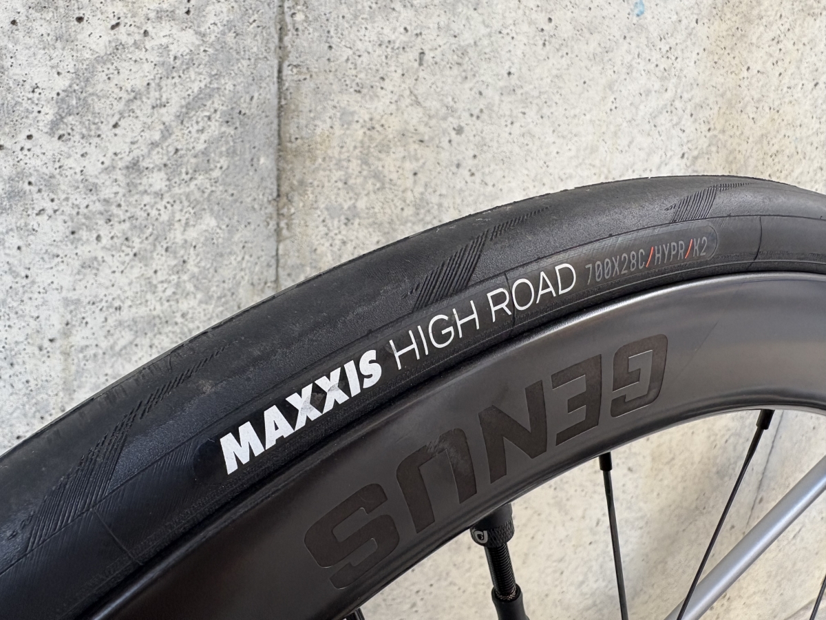 タイヤにはNEW MAXXIS HIGH ROAD 28c クリンチャーを採用です。HIGH ROADシリーズはこれで4本目です。とくに前作のHIGH ROAD SLはサイドが薄く、軽く、クライマーおすすめの一本でした。軽量タイヤに分類されながらツルっと滑りそうなことはなく安定感があり、MAXXISの目指すロードタイヤへの理想が見えた気がしました。今回はベーシックなHIGH ROADですが、グリップの良さやしなやかさなどは健在で、クリンチャータイヤでも乗り心地の良さは両立できるのだと感じました。MAXXISの真面目な物作りへの姿勢を感じることができました。とくに昨今のロードタイヤのコストは年々上昇傾向にあると思います。コスパの高さも魅力的なタイヤです。