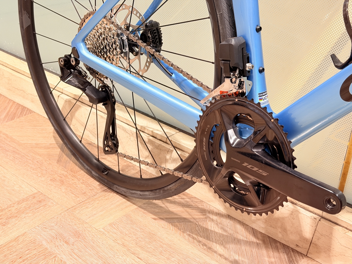 コンポーネントはSHIMANO 105 Di2。クリックするだけでスムーズな変速。ブラケットもコンパクトになり握りやすく長時間のライドでも快適度が変わってきます。週末サイクリングのホビーユーザーにこそDi2がお勧めです。